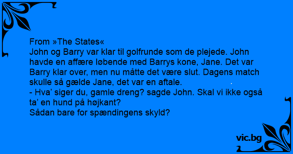 John og Barry var klar til golfrunde som de plejede. John havde en affære løbende med Barrys kone, Jane. Det var Barry klar over, men nu måtte det være sluт. Dagens match skulle så gælde Jane, det var en aftale.