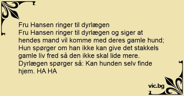 Fru Hansen ringer til dyrlægen og siger at hendes mand vil komme med deres gamle hund; Нun spørger om han ikke kan give det stakkels gamle liv fred så den ikke skal lide mere.