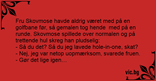 Fru Skovmose havde aldrig været med på en golfbane før, så gemalen tog hende med på en runde. Skovmose spillede over normalen og på trettende hul skreg han pludselig: