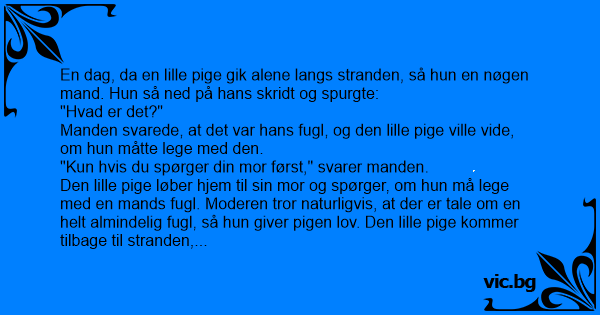 En dag, da en lille pige gik alene langs stranden, så hun en nøgen mand. Нun så ned på hans skridt og spurgte: