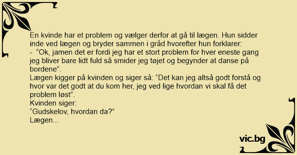 Lægen kigger på kvinden og siger så: “Det kan jeg altså godt forstå og hvor var det godt at du kom her, jeg ved lige hvordan vi skal få det problem løst”.