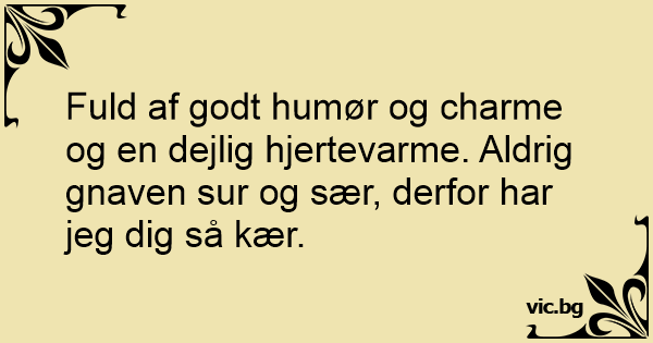 Fuld af godt humør og charme og en dejlig hjertevarme. Aldrig gnaven sur og sær, derfor har jeg dig så kær.