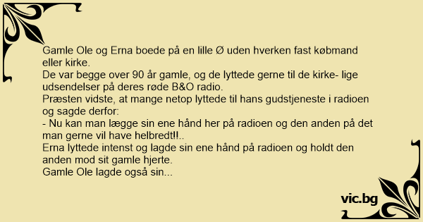 Gamle Ole lagde også sin ene hånd på radioen og lod den anden ligge i skødet, så at sige… Erna kastede et kærligt blik på sin gamle mand og sagde: