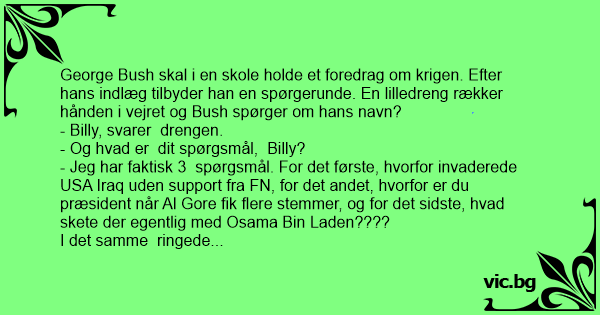 - Jeg har 5 spørgsmål. Først, hvorfor invaderede USA Irag uden support fra FN, for det andet, hvorfor er du præsident når Al Gore fik flere stemmer, for det tredie, hvad skete der egentlig med Osama Bin Laden, for det fjerde, hvorfor ringede skoleklokken 20 min. før normaltid og for det femte, hvad er der sket med Billy???