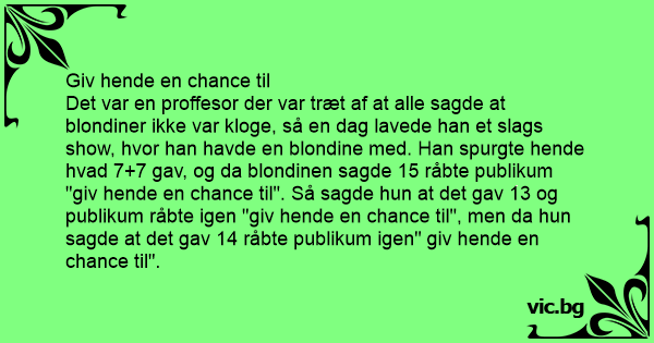 Det var en proffesor der var træt af at alle sagde at blondiner ikke var kloge, så en dag lavede han et slags show, hvor han havde en blondine med. Han spurgte hende hvad 7+7 gav, og da blondinen sagde 15 råbte publikum "giv hende en chance til". Så sagde hun at det gav 13 og publikum råbte igen "giv hende en chance til", men da hun sagde at det gav 14 råbte publikum igen" giv hende en chance til".