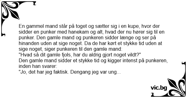 På en station steg en gammel mand på toget og satte sig ind i en kupé. Her kom han til at sidde overfor en punker med hanekam, øreringe og hele Pivtøjet. De sidder og kigger lidt på hinanden, og...