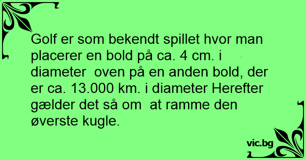 Golf er som bekendt spillet hvor man placerer en bold på ca. 4 cm. i diameter oven på en anden bold, der er ca. 13.000 km. i diameter Herefter gælder det så om at ramme den øverste kugle.