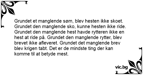 Grundet et manglende søm, blev hesten ikke skoet. Grundet den manglende sko, kunne hesten ikke ride. Grundet den manglende hest havde rytteren ikke en hest at ride på. Grundet den manglende rytter, blev brevet ikke afleveret. Grundet det manglende brev blev krigen tabt. Det er de mindste ting der kan komme til at betyde mest.