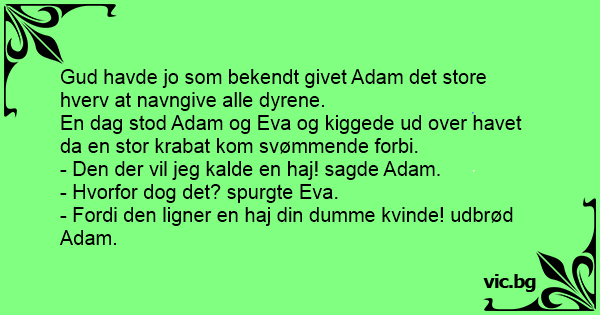 En dag stod Adam og Eva og kiggede ud over havet da en stor krabat kom svømmende forbi.