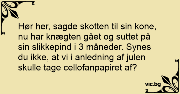Hør her, sagde skotten til sin kone, nu har knægten gået og suttet på sin slikkepind i 3 måneder. Synes du ikke, at vi i anledning af julen skulle tage cellofanpapiret af?