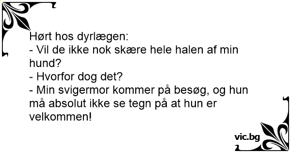 Un gars dit à un autre : Мутра отива при ветеринарен лекар и води немска овчарка. Una signora porta il cane dal veterinario e gli chiede di tagliare la coda all'animale. Il dottore lo visita e poi chiede alla padrona: "Il suo cane gode di ottima salute, perchè vuole tagliargli la coda?" "Perchè domani arriva mia suocera e non vorrei che, vedendolo scodinzolare, credesse di... Bert took his Saint Bernard to the vet. "Doctor," he said sadly, "I'm afraid I'm going to have to ask you to cut off my dog's tail." The vet stepped back, "Bert, why should I do such a terrible... Facet z pięknym psem przychodzi do weterynarza i mówi: prosze obciąć psu ogon. - Weterynarz na to, szkoda, taki piękny pies - Właściciel: proszę nie dyskutować tylko ciąć. - Ale dlaczego? -... O sujeito ao saber que a querida sogra viria visita-los mandou cortar o rabo do cachorro. A mulher indignada, pergunta: - Mas querido, por quê voce fez isso? - Quanto sua mãe chegar eu não quero... O sujeito leva o cachorro ao veterinário. — Eu quero cortar o rabo do meu cachorro! O veterinário, acostumado a esse tipo de serviço, obedece calado. Vinte minutos depois está de volta. — Pronto,... - ¡Querida! ¿Mañana viene a cenar tu madre? - ¡Si amor! ¿Por qué esa pregunta? - ¡Para cortarle la cola al perro! No quiero que nadie de muestras de alegría cuando llegue esa vieja! Grafas sako savo liokajui: - Rytoj atvažiuoja mano žmonos motina. Prašau nukirsti šuniui uodegą. Noriu, kad niekas nesidžiaugtų, kad atvažiuoja uošvė!