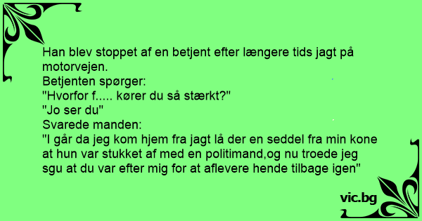 "I går da jeg kom hjem fra jagt lå der en seddel fra min kone at hun var stukket af med en politimand,og nu troede jeg sgu at du var efter mig for at aflevere hende tilbage igen"
