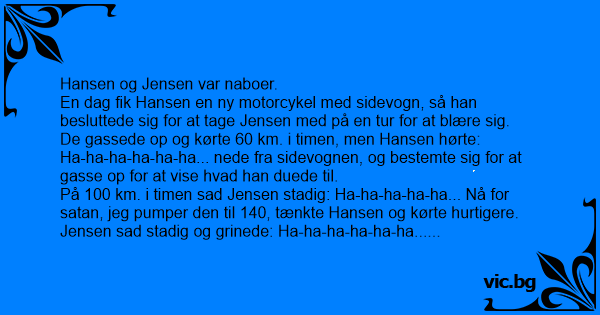 På 100 km. i timen sad Jensen stadig: Ha-ha-ha-ha-ha... Nå for sатаn, jeg pumper den til 140, tænkte Hansen og kørte hurtigere.