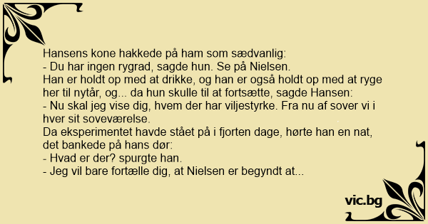 - Jeg vil bare fortælle dig, at Nielsen er begyndt at ryge igen, sagde fru Hansen med spag røst.