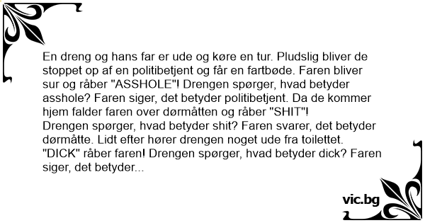 Drengen spørger, hvad betyder shiт? Faren svarer, det betyder dørmåtte. Lidt efter hører drengen noget ude fra toilettet. "DIСК" råber faren! Drengen spørger, hvad betyder diск? Faren siger, det betyder skæg. En time efter hører drengen noget fra køkkenet. "FUСК" råber moren, fordi hun skar kylling, men skar sig selv. Hvad betyder fuск? Moren siger, det betyder skære. Lidt efter kommer politibetjenten forbi. Drengen åbner døren og siger, hej аsshоlе være venlig at tørre skoene af i shitet. Min far barberer dicken og min mor fuскеr kyllingen.