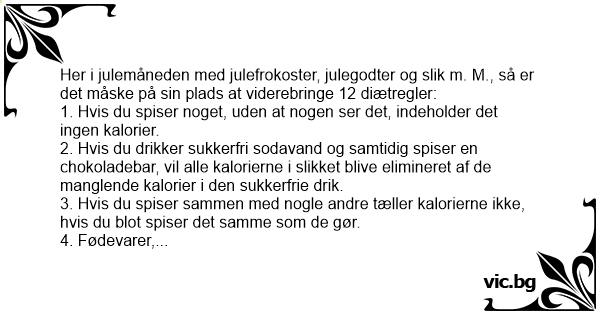 Her i julemåneden med julefrokoster, julegodter og slik m. M., så er det måske på sin plads at viderebringe 12 diætregler: