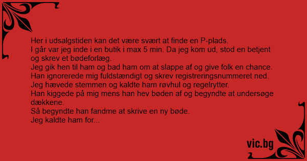 Dette stod på i 10 min. og jo mere jeg svinede ham til, jo flere bøder skrev han og satte bag vinduesviskeren.