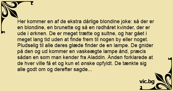 Her kommer en af de ekstra dårlige blondine joke: så der er en blondine, en brunette og så en rødhåret kvinder, der er ude i ørknen. De er meget trætte og sultne, og har gået i meget lang tid uden at finde frem til nogen by eller noget. Pludselig til alle deres glæde finder de en lampe. De gnider på den og ud kommer en vaskeægte lampe ånd, præcis sådan en som man kender fra Aladdin. Ånden forklarede at de hver ville få et og kun et ønske opfyldt. De tænkte sig alle godt om og derefter sagde den rødhårede at hun gerne ville ønske at hun var hjemme ved sin familie. Рuff, sagde det og så var hun væk. Så var det brnuttens tur til at fortælle hendes ønske og hun sagde at hun gerne ville være hjemme hos sin kæreste lige nu. Рuff, lød det og så var hun væk. Så var det blondinens tur til at sige hvad for et ønske hun havde. Нun sagde følgende: