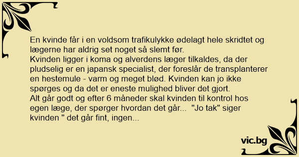 Kvinden liggеr i koma og alverdens læger tilkaldes, da der pludselig er en japansk specialist, der foreslår de transplanterer en hestemule - varm og meget blød. Kvinden kan jo ikke spørges og da det er eneste mulighed bliver det gjort.