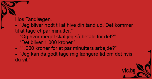 Hørt på tannlegekontoret: - Hva koster det å trekke denne tannen? - Det koster 150 kr. - 150 kroner? Og så er det gjort på bare 20 sekunder? - Tja… Jeg kan godt holde på lengre.