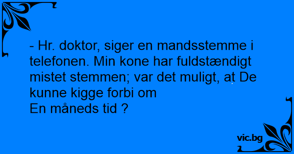 - Hr. doktor, siger en mandsstemme i telefonen. Min kone har fuldstændigt mistet stemmen; var det muligt, at De kunne kigge forbi om