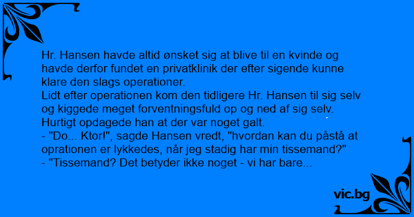 - "Do... Ktor!", sagde Hansen vredt, "hvordan kan du påstå at oprationen er lykkedes, når jeg stadig har min tissemand?"