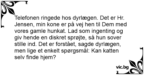 Telefonen ringede hos dyrlægen. Det er Hr. Jensen, min kone er på vej hen til Dem med vores gamle hunkat. Lad som ingenting og giv hende en diskret sprøjte, så hun sover stille ind. Det er forstået, sagde dyrlægen, men lige et enkelt spørgsmål: Kan katten selv finde hjem?