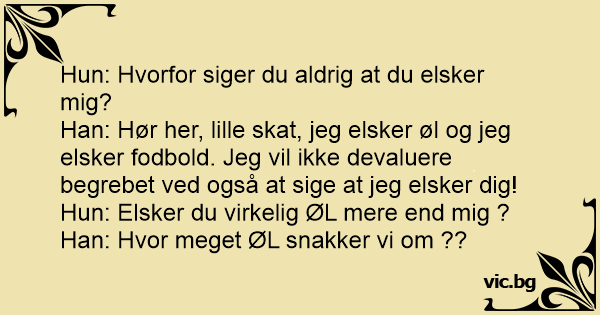Han: Hør her, lille skat, jeg elsker øl og jeg elsker fodbold. Jeg vil ikke devaluere begrebet ved også at sige at jeg elsker dig!