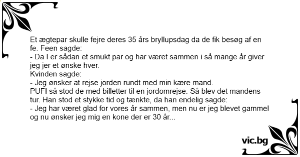 Der var engang en fe der sagde til et par: "Nu har I været gift i 30 år uden at skændes ret meget, så derfor får I hvert et ønske. Konen først." Konen svarede: "Så vil jeg da gerne rejse verden...