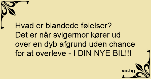 Какво означава противоречиви чувства? Пример за смесени чувства: Какво означава "смесени чувства"? Реклама на застрахователна компания: Was sind gemischte Gefühle? Wenn deine Schwiegermutter in deinem neuen Mercedes rückwärts auf eine Klippe zufährt. Qu'est-ce qu'un sentiment partagé ? Ta belle-mère qui percute un poids-lourds au volant de ta nouvelle voiture. Wat is het toppunt van gemengde gevoelens?? Je schoonmoeder in je gloednieuwe BMW een ravijn in zien rijden. Q:What's the definition of mixed emotions? A:When you see your mother-in-law backing off a cliff in your brand new car. Mężczyzna mówi do żony: - Teściowa jechała moim samochodem i wpadła w przepaść. - No i? - odpowiada żona. - No i mam mieszane uczucia. Kiedy są mieszane uczucia? - Gdy teściowa spada w przepaść Twoim samochodem. Sentimente amestecate: Sa-ti cada soacra in prapastie cu masina Ta... - Mi az abszolút vegyes érzelem? - Ha látjuk, amint az anyósunk a szakadékba zuhan a vadonatúj Mercedesünkkel. Blandade känslor uppstår när svärmor kör ut från en djup avgrund utan en chans för att överleva – I DIN NYA BIL!!!