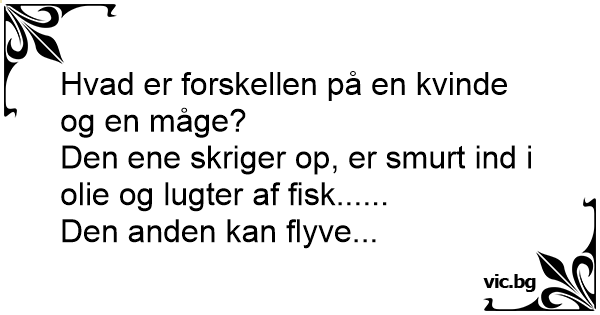 Hvad er forskellen på en kvinde og en måge?<br />Den ene skriger op, er smurt ind i olie og lugter af fisk......<br />Den anden kan flyve...