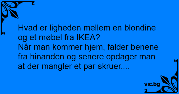Hvad er ligheden mellem en blondine og et møbel fra IKEA? Når man kommer hjem, falder benene fra hinanden og senere opdager man at der mangler et par skruer....