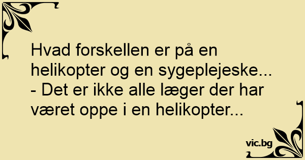 Hvad forskellen er på en helikopter og en sygeplejeske...<br />- Det er ikke alle læger der har været oppe i en helikopter...