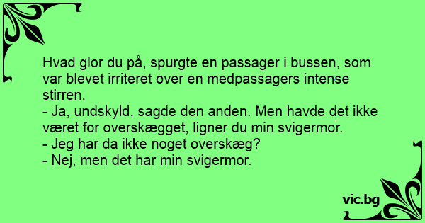 - Ja, undskyld, sagde den anden. Men havde det ikke været for overskægget, ligner du min svigermor.