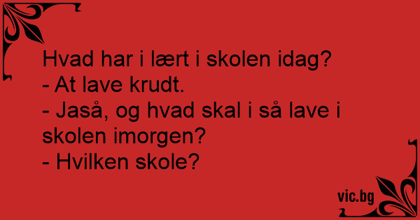 Da lille Søren kom hjem, spurgte hans mor: Hvad har du lavet i skole i dag? Lille kim svarer: Jeg har leget med springstoffer! Moren svarer derefter: Jeg troede i var i skole for at lære noget?!...