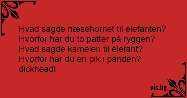 Elefanten og Kamelen Elefanten spurgte kamelen: - Hvorfor sidder dine patter egentligt på maven? Så svarede kamelen: - HAH! Og sådan et spørgsmål skulle komme fra en, der har sin pik siddende i...