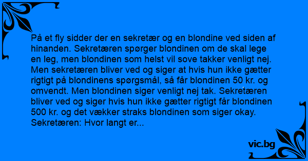 På et fly sidder der en sekretær og en blondine ved siden af hinanden. Sekretæren spørger blondinen om de skal lege en leg, men blondinen som helst vil sove takker venligt nej. Men sekretæren bliver ved og siger at hvis hun ikke gætter rigtigt på blondinens spørgsmål, så får blondinen 50 kr. og omvendt. Men blondinen siger venligt nej tak. Sekretæren bliver ved og siger hvis hun ikke gætter rigtigt får blondinen 500 kr. og det vækker straks blondinen som siger okay.