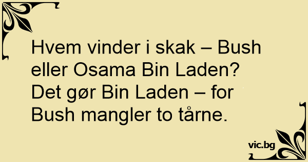 Vem vinner i schack – Bush eller Osama Bin Ladin? Det gör Bin Ladin eftersom Bush saknar två torn.