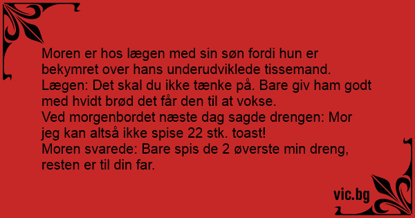 Ved morgenbordet næste dag sagde drengen: Mor jeg kan altså ikke spise 22 stk. toast!