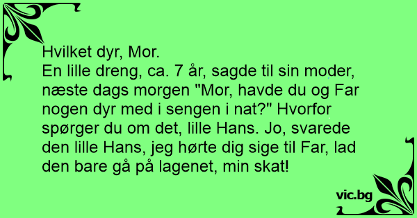 En lille dreng, ca. 7 år, sagde til sin moder, næste dags morgen "Mor, havde du og Far nogen dyr med i sengen i nat?" Hvorfor spørger du om det, lille Hans. Jo, svarede den lille Hans, jeg hørte dig sige til Far, lad den bare gå på lagenet, min skat!