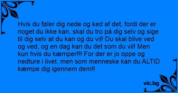 Hvis du føler dig nede og ked af det, fordi der er noget du ikke kan, skal du tro på dig selv og sige til dig selv at du kan og du vil! Du skal blive ved og ved, og en dag kan du det som du vil! Men kun hvis du kæmper!!! For der er jo oppe og nedture i livet, men som menneske kan du ALTID kæmpe dig igennem dem!!