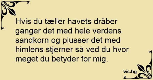 Hvis du tæller havets dråber ganger det med hele verdens sandkorn og plusser det med himlens stjerner så ved du hvor meget du betyder for mig.