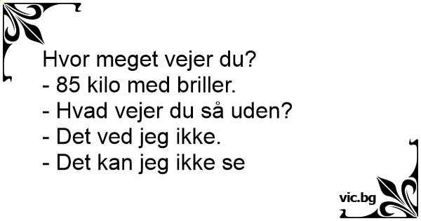 - Hvor mye veier du? - Seksti kilo med briller. - Men brillene kan da ikke spille noen rolle? - Jo, for uten dem kan jeg ikke se vekten.