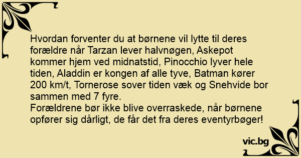 Hvordan forventer du at børnene vil lytte til deres forældre når Tarzan lever halvnøgen, Askepot kommer hjem ved midnatstid, Pinocchio lyver hele tiden, Aladdin er kongen af alle tyve, Batman kører 200 km/t, Tornerose sover tiden væk og Snehvide bor sammen med 7 fyre.