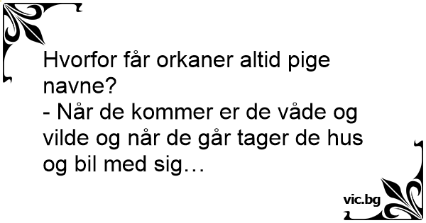 Opkaldt efter kvinder Hvorfor er alle orkaner opkaldt efter kvinder? – Fordi de er våde og vilde når de kommer, og så tager de både hus og bil med sig når de går!