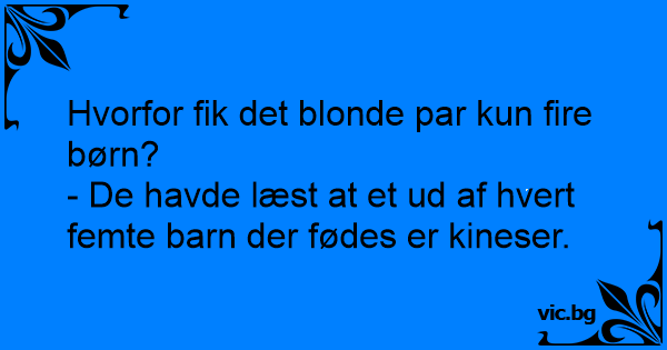 - Olyan boldog vagyok a három gyerekemmel! - mondja a szőke. - Nem szeretnél még egyet? - kérdezi a másik. - Nem, mert azt olvastam, hogy a világon minden negyedik gyerek kínai!