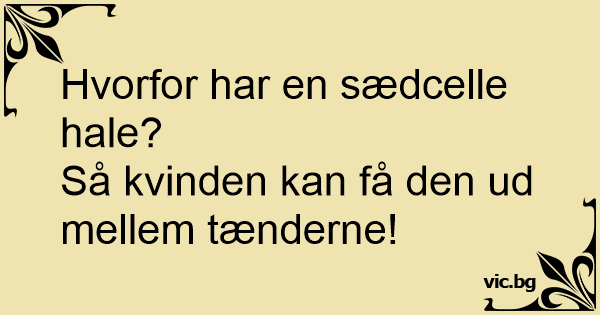 Сперматозоид Профессор на лекции задает вопрос аудитории: Професор на лекции пита: Warum haben Spermien die kleinen Schwänzchen? Damit man sie zwischen den Zähnen wieder rauskriegt!!! Hvorfor har sædceller haler? Så kvinder har noget at trække i hvis de sidder fast mellem tænderne. Víte, proč mají spermie ocásky? . . Aby šli vytahovat ze zubů ... Stiti dc spermatozoizii au coada?ca sa ii scoata fetele mai repede dintre dinti Warum haben Spermien am Ende einen Schwanz? Damit die Frauen die Reste besser aus den Zähnen bekommen.