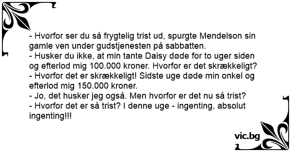 - Husker du ikke, at min tante Daisy døde for to uger siden og efterlod mig 100.000 kroner. Hvorfor er det skrækkeligt?