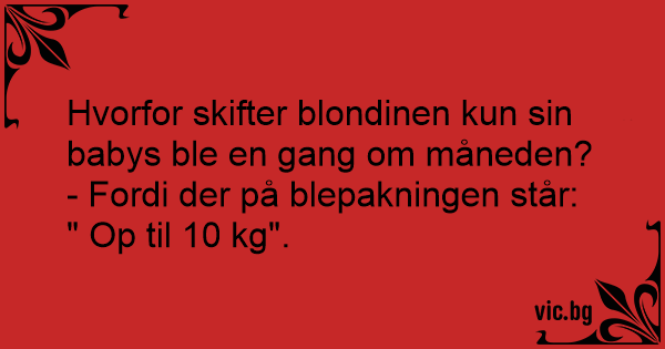 Velbekomme Spørgsmål: Hvorfor skifter blondinen kun bleen på sin baby en gang om måneden? Svar: Fordi der står op til 10 kg på pakken.