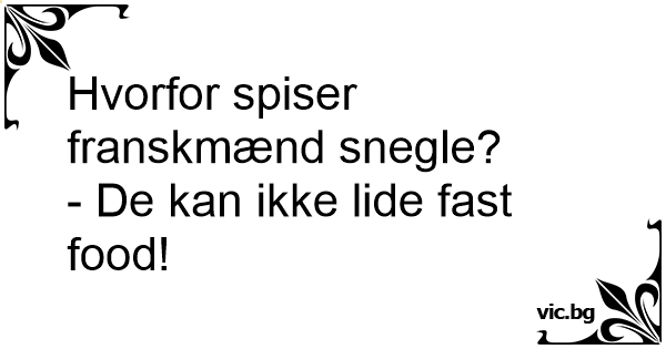 Wieso essen Franzosen Schnecken? Weil sie kein Fast Food mögen. Защо французите ядат охлюви? - Защото мразят fast food ¿Por qué los franceses comen caracoles? Porque no les gusta la comida rápida. Varför äter norrmän sniglar? - För att de inte gillar snabbmat. Q: Why do the French eat snails? A: They don't like fast food. Hvorfor spiser franskmenn sneiler? Svar: De liker ikke fastfood! Varför tycker fransmän om sniglar? De tycker inte om snabbmat